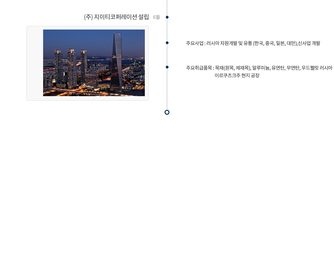 지이티코퍼레이션은 러시아를 중심으로 에너지 자원사업을 바탕으로 한국, 중국, 일본, 대만 등에 수출하여 꾸준히 성장하고 있습니다.